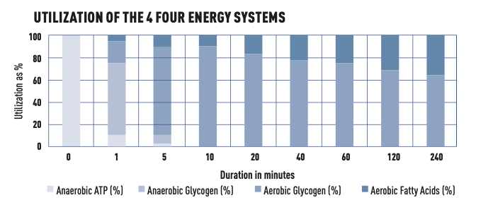 Actually, it’s meaningful training which helps build a solid foundation. Figure 5 shows which fuel is most useful to you in percentage terms at maximum effort. You can see that, starting from 5 minutes, your glycogen and your fatty acids are the main fuels used. In this figure, we make the assumption that you run as fast as possible. If you run slower, you will use more fatty acids, proportionally. Smart variation in intensity and duration of your workouts ensures that all energy systems are trained. Note: through smart training and healthy nutrition you can train your body to run more efficiently on your fatty acids.