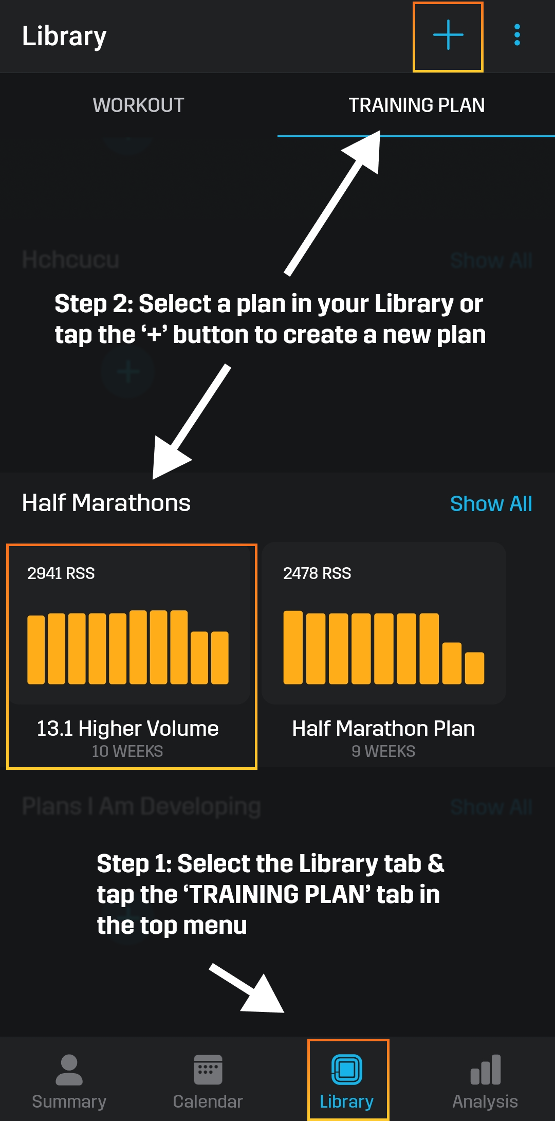 Next, you can select a plan from your Training Plan Library to edit it or create a new training plan by tapping the ‘+’ icon in the top right corner.