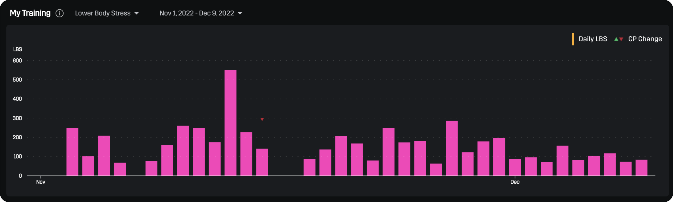 Lower Body Stress Score is graphed on a run-by-run basis when viewing your ‘My Training’ chart on the Stryd PowerCenter and your ‘Summary’ view on the Stryd mobile app.