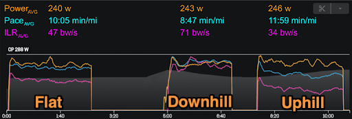 Impact Loading Rate (colored pink in the figure above), which is accumulated as an input to LBSS, generally increases on the downhill, decreases on the uphill, and generally increases when increasing running speed or intensity.