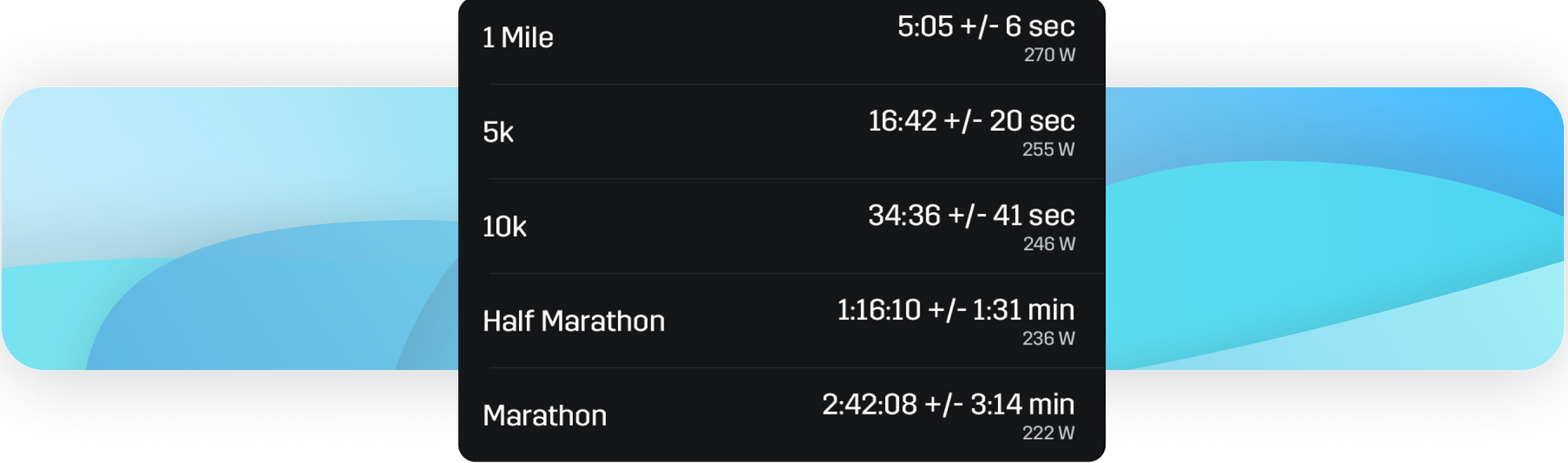 You will see your expected race times for distances from 1 Mile to Marathon and the power output you would need to sustain to achieve each performance.