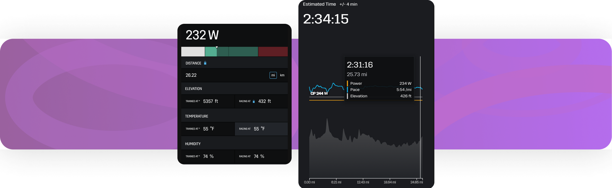 Race Power Calculator takes parameters like your race course profile and expected environmental conditions on race day like temperature and humidity to give you the most precise expectation on your race day performance.