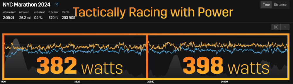 This is a major achievement considering the demanding circumstances and the short time between events. His strategy and pacing on race day in NYC contributed heavily to this improvement, especially when looking at his power outputs changed during the race.