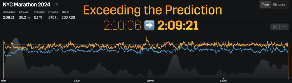 Just a few months earlier, he had run 2:08:44 at the Paris Olympic Marathon, and using Stryd data, that converted to a predicted time of 2:10:06 for the New York City Marathon.