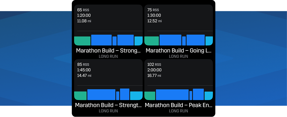 - Marathon Build – Strength & Stamina: You will start this 105 minute long run with a 20 minute warm up followed by 45 minutes at a moderate effort, 5 minutes easy, and 15 minutes at your marathon power. You will end with a 20 minute cool down.
