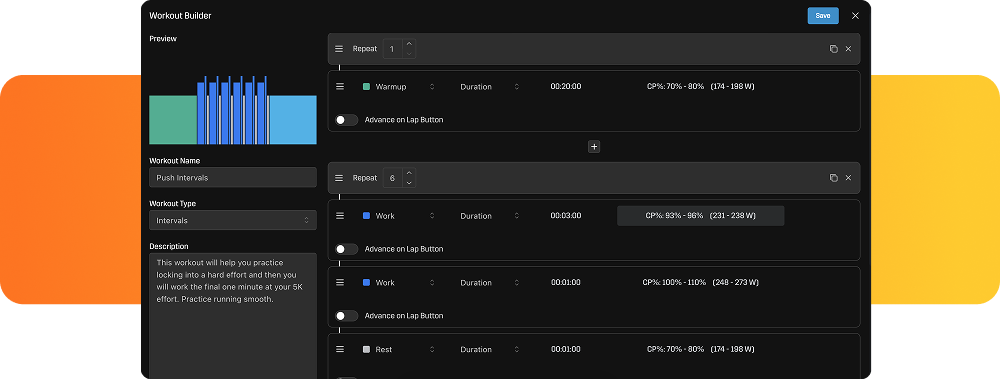 Precision tweaks ensure you consistently meet training targets and maintain progress. With easy edits at your fingertips, you can quickly adjust power zones, interval durations, and recovery periods to optimize your training efficiency.
