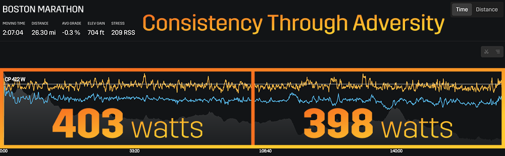 For the first 20 miles, Clayton maintained power output within an astonishing ~1% of his total average power. This level of consistency demonstrates exceptional control and pacing intelligence, especially on Boston's challenging course with its notorious hills.