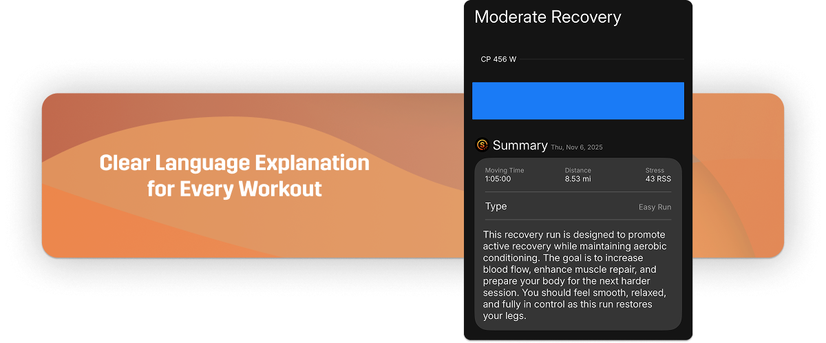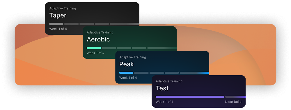 Your training unfolds through purposeful phases—Base, Peak, Test, Recovery, and Maintenance—that organize your work into blocks designed to help you improve efficiently. Throughout this progression, you receive daily workouts that sync automatically to your watch, along with clear, plain-language explanations for what's changing and why.
