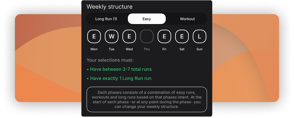From there, you structure your week in a way that makes sense for you. Choose which days work for easy runs, workouts, and your long run—Monday through Sunday—so the plan follows your rhythm. Whether you're working around an eight-day shift pattern or juggling family commitments, the system flexes to fit.