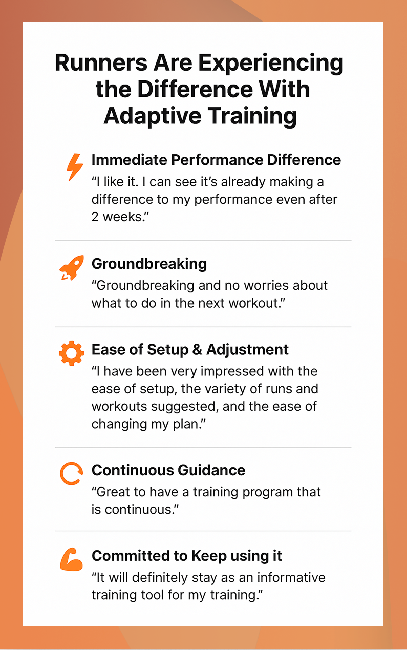 One runner captured it perfectly when they said Adaptive Training "allows both structure and forgiveness when life gets in the way."