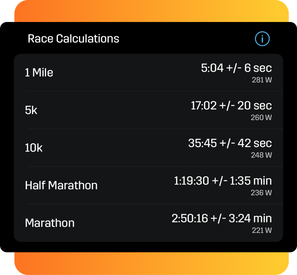 Receive expected race times and necessary power outputs for distances from 1 Mile to Marathon, updating as your fitness improves. This tool is invaluable for monitoring progress and strategizing for race day.