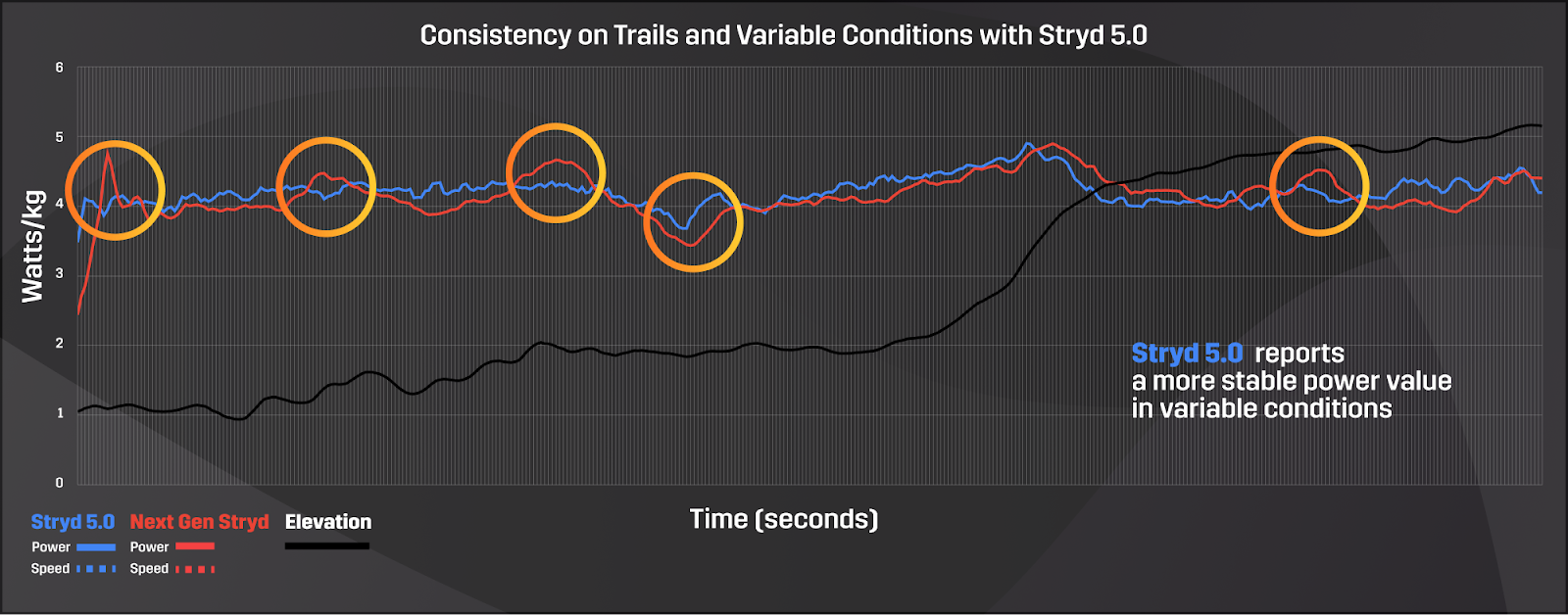 Stryd 5.0 is built for exactly that kind of complexity. In the run above, on a rolling trail with shifting surfaces, wind, and grade changes, the Stryd 5.0 trace stays steadier and more coherent, while the Stryd Next Gen line deviates more in places and shows less stability as conditions stack on top of each other.