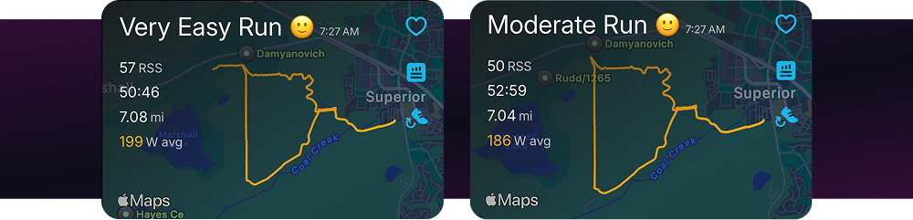 I ran the same route twice last week. Saturday was easy at 7:45 pace. Next Friday, I pushed tempo at 6:50 for 7 miles.