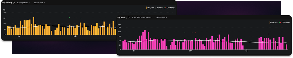 Running Stress Score (RSS) captures the metabolic side. It scores how long and how hard you ran relative to your Critical Power. One hour at CP gives you roughly 100 RSS. Think of it as how much your cardiovascular and energy systems worked.