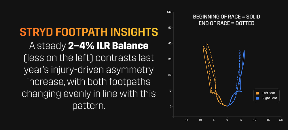 In 2025, Dakotah’s race reflected an athlete managing an injury. As fatigue set in, asymmetry between her left and right sides increased, a clear sign of compensation.